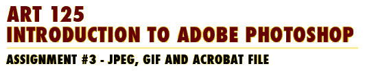 To understand how to create a Adobe Acrobat file combining Adobe Photoshop and Adobe Acrobat. You must send me an Acrobat file via email. It must me 7 pages at 10" square. The seven different pages should each profile some technique learned in class. For example one page could be proficient demonstration of the pattern tool. Another could demonstrate the paintbrush tool. Another could demonstrate changing color (before/after) etc. etc. The final PDF cannot be larger than 8 megabytes.